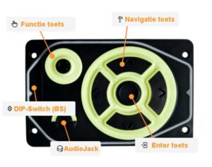 - Navigatie toetsen en Enter toets – Tactiel bedieningspaneel: Het apparaat beschikt over verlichte, fysieke navigatietoetsen (zoals pijlen en een ‘Enter’-toets) die makkelijk te herkennen zijn op de tast. Dit stelt gebruikers in staat om door de verschillende menu-items te bladeren zonder het touchscherm aan te raken en/of naar het scherm te hoeven kijken.